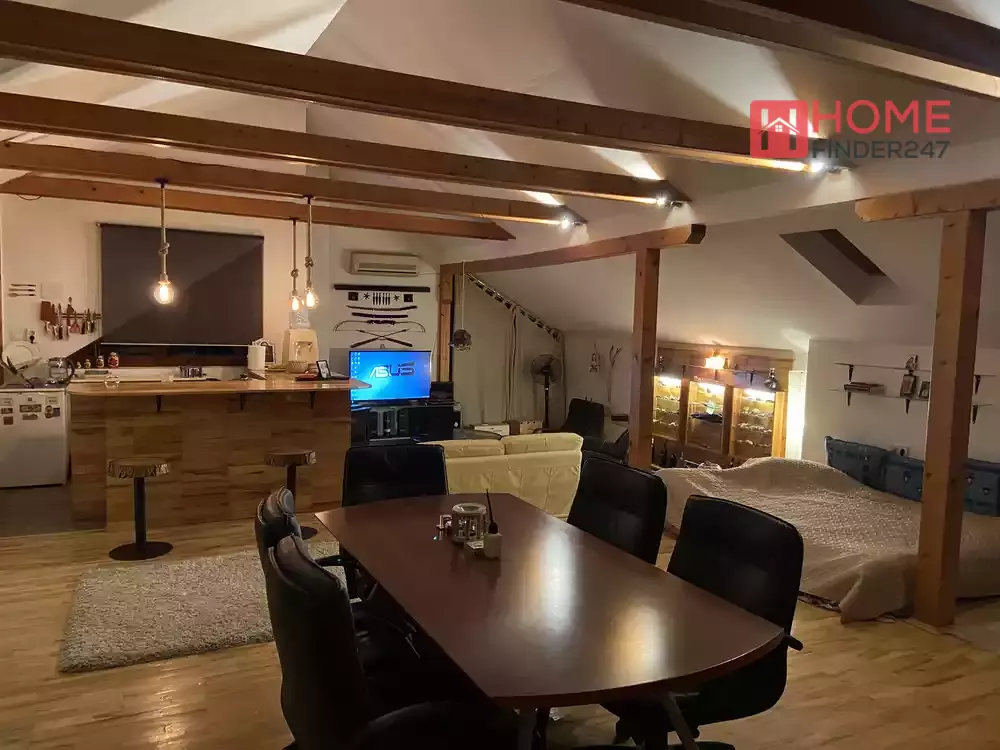 Attic furnished in Scandinavian style using natural wood materials, gallery bedroom, kitchen, bathroom and terrace.