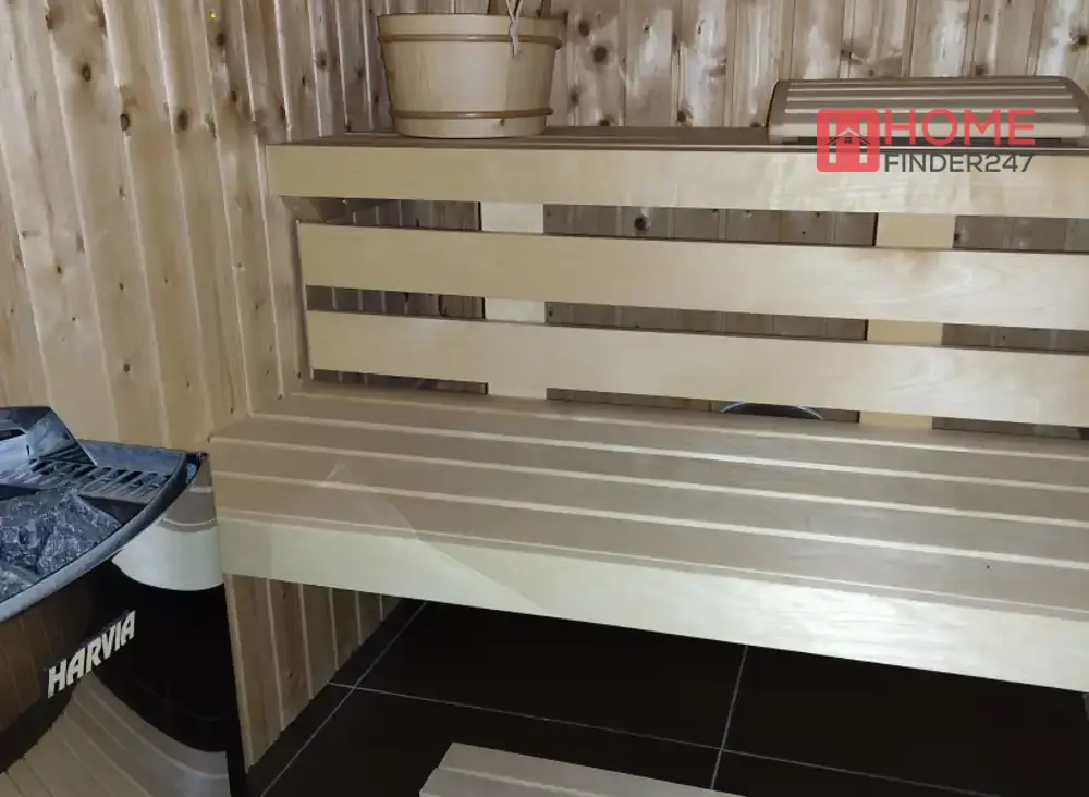 Станот се наоѓа на втори кат и нуди голема дневна соба, кујна со трпезарија, три спални соби, две тоалети и сауна.