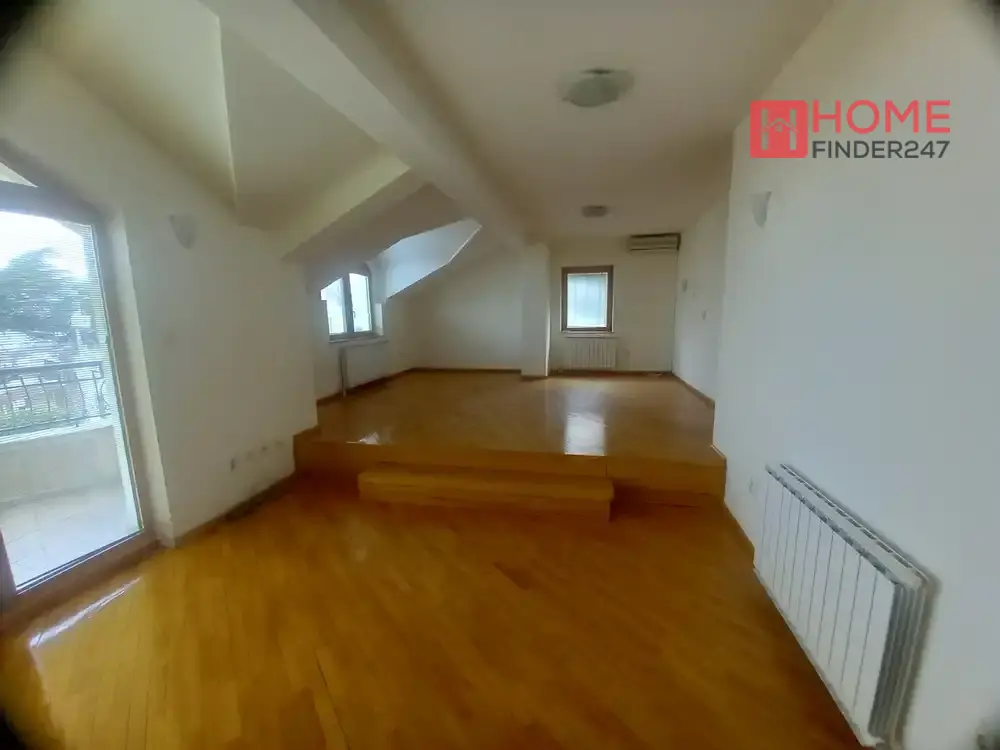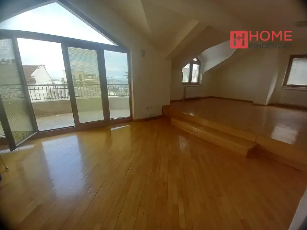 На горниот кат има голема отворена дневна соба со тераса која нуди убав поглед кон градот, 3 спални соби, 2 купатила и сервисна просторија.