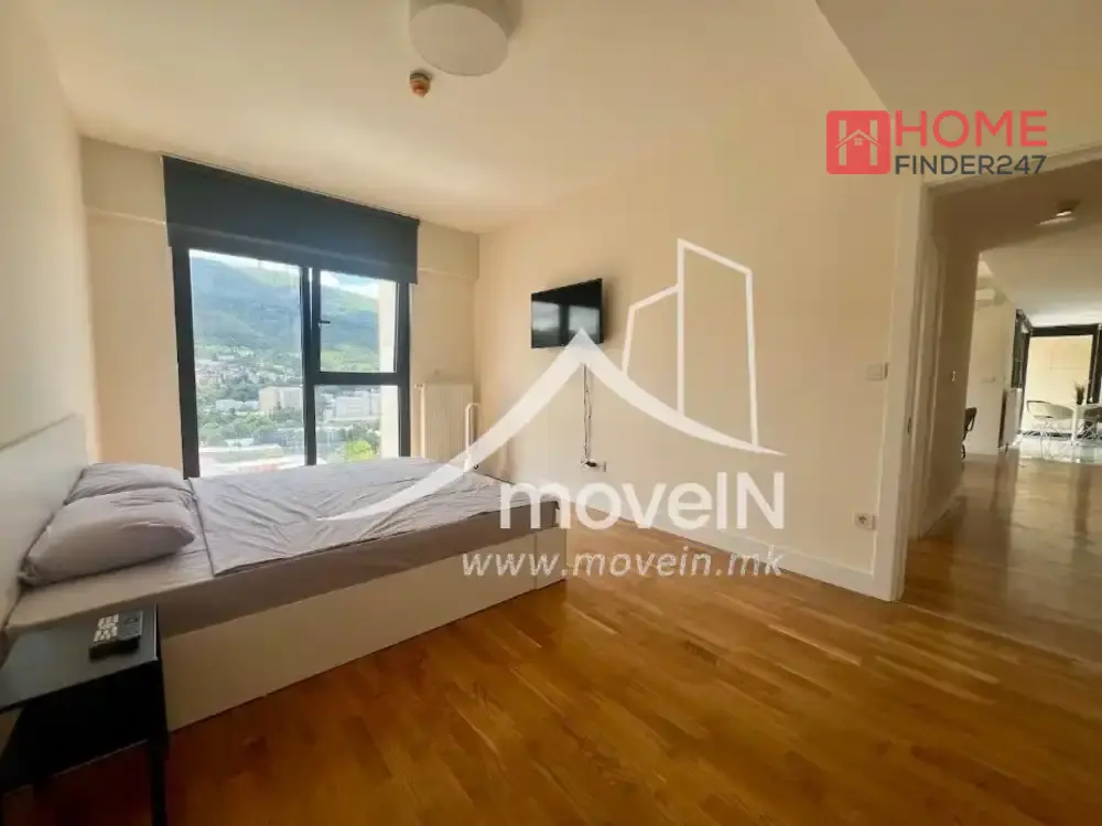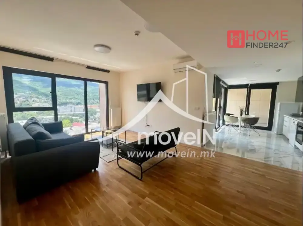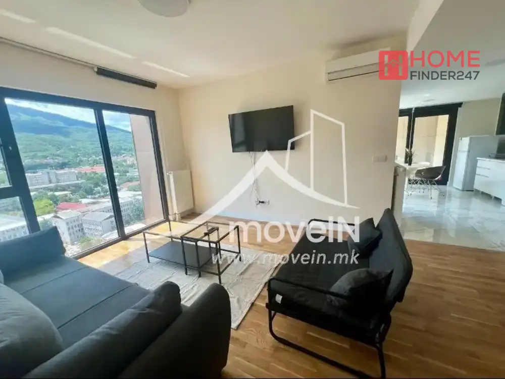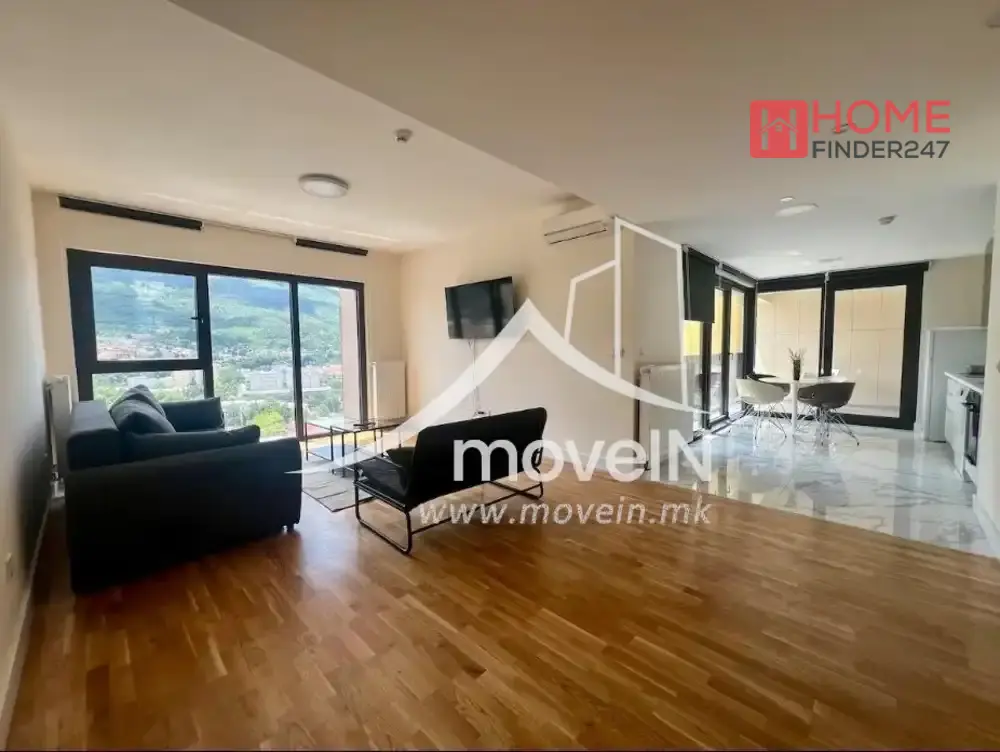 Станот има дневна соба, опремена кујна, две спални соби со поглед кон Водно, две бањи, централно греење и тераса.