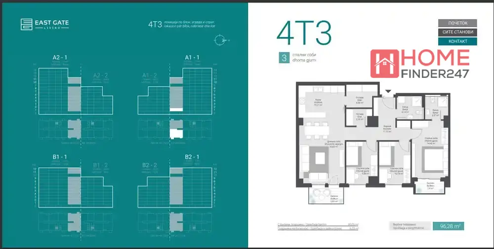 Станот се состои од три пријатни соби со варијабилна големина од 96 м2, 97 м2 и 98 м2, распоредени на деловите од приземје до 11-от кат.