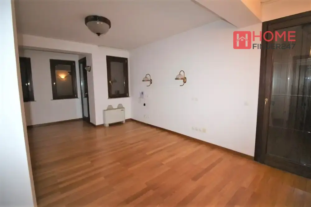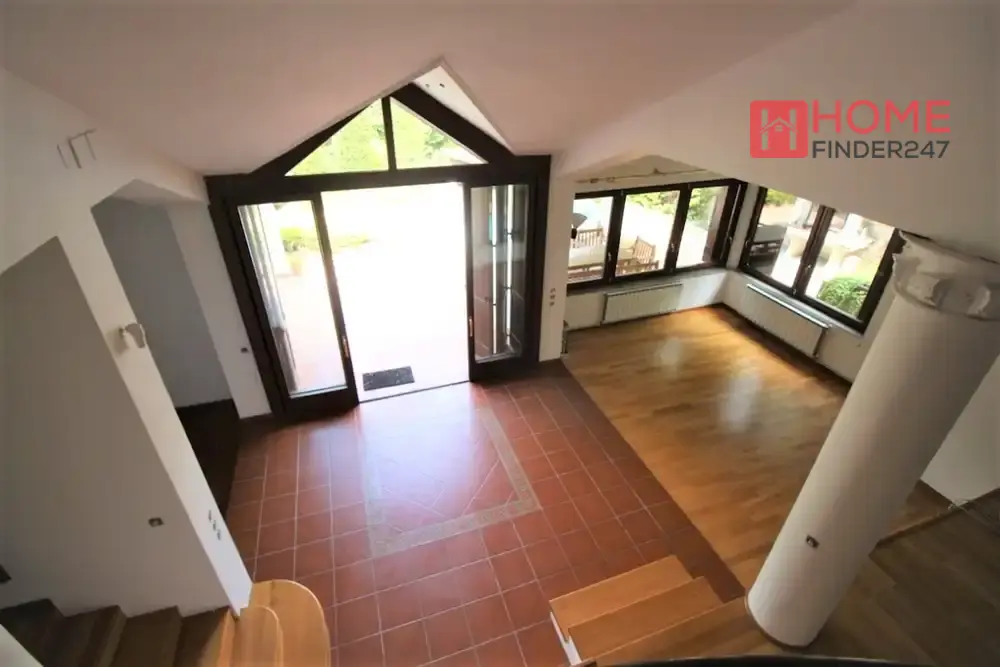 Првиот кат располага со голема дневна со камин, трпезарија, гостијски тоалет, две посебни складови простории, кујна и посебен спа дел со сауна, туш кабини и тоалет.